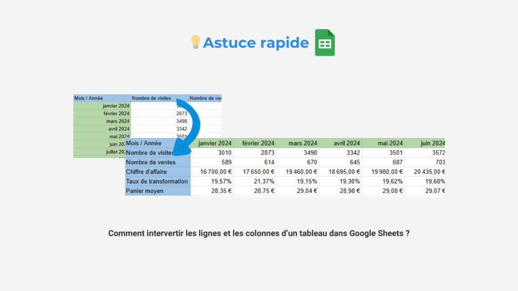 - Astuce express : la fonction TRANSPOSE sur Google SheetsVous perdez du temps à réécrire manuellement vos tableaux dans Google Sheets ? 😵💫 💡 Bonne nouvelle ! Dans cette première vidéo « Astuce express », je vous présente deux méthodes ultra… Lire la suite : Astuce express : la fonction TRANSPOSE sur Google Sheets